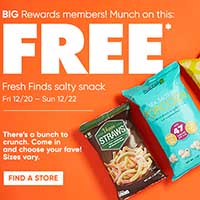 Big Rewards members can snag Free Fresh Finds Snacks – kettle chips, potato chips, kettle corn, popcorn, cheese puffs or veggie straws, sizes vary. Valid from December 20-22, 2019. The offer should already be added to your account. Present your Big Rewards card at register to redeem. While stocks last.
