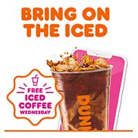 Dunkin’s offers their Rewards members a Free Medium Iced Coffee on Wednesdays through August 10, 2022. Must order ahead on the Dunkin app. Limited to one per customer. Valid at participating restaurants in AR, AZ, CA, CO, HI, IA, KS, MO, NE, NM, NV, OK, TX, UT.