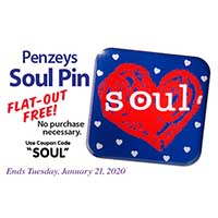 Print the linked coupon to redeem for a Free Penzeys Soul Pin, present it at checkout. You can order online as well, using “SOUL” discount code, but shipping and handling are not covered. Valid till midnight on Tuesday, January 21, 2020. Limited to one per household. While stocks last.
